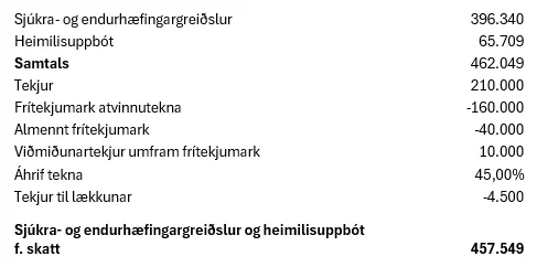 Sjá má á dæminu hér fyrir ofan að atvinnutekjur eru 200.000 krónur og fjármagnstekjur 10.000 krónur á mánuði. Frítekjumark atvinnutekna er 160.000 kr. sem dregst frá og almennt frítekjumark er 40.000 kr. sem dregst einnig frá. Því eru viðmiðunartekjur umfram frítekjumörk 10.000 kr. Af þeirri fjárhæð er reiknuð 45% skerðing sem nemur þá 4.500 krónum. Heildargreiðsla fyrir skerðingu er samtals 462.049 krónur. Af því eru dregnar 4.500 krónur og því eru sjúkra- og endurhæfingargreiðslur og heimilisuppbót 457.549 krónur.
