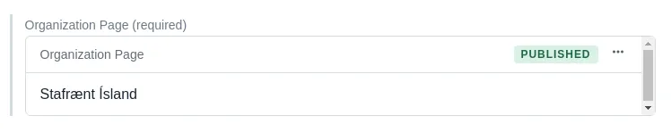 Þegar þessir þrjá reitir eru útfylltir, er síðan aðgengileg á island.is/stofnanir/[slug stofnunnar]/[slug síðu]. Ef stofnunin hefur slug syslumenn og undirsíðan slug saga þá birtist undirsíðan á (<http://island.is/stofnanir/syslumenn/saga>).