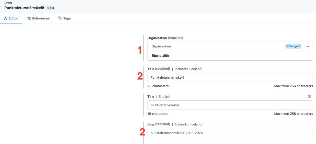 Byrja á að tengja Event við rétt Organization.