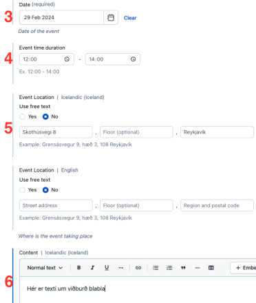 Mynd B. Event - Birtist á síðu viðburðarins (valfrjáls reitur).