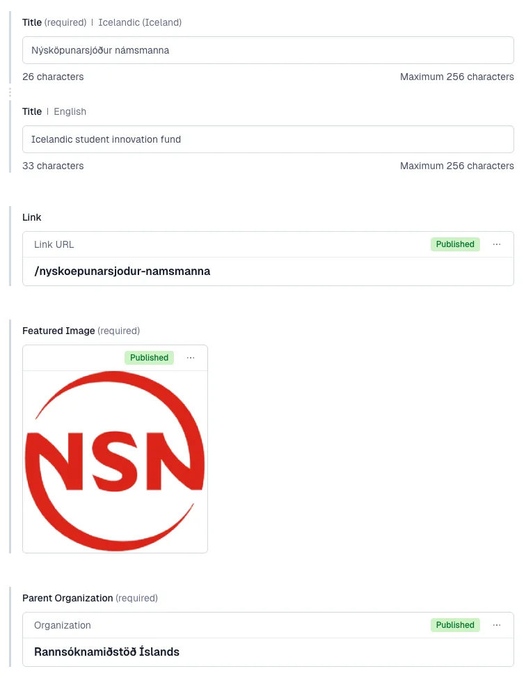 Ef ekki er til merki fyrir sjóð má nota merki viðkomandi stofnunar (sem er trúlega þegar til skráð í Contentful).