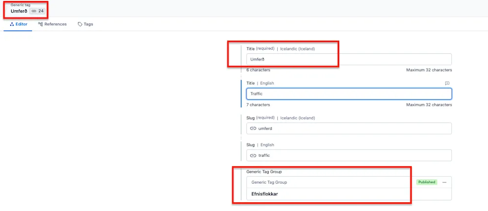 Svo þarf að búa til Generic tag fyrir hvern flokk sem á að nota - sem er lýsandi fyrir þann efnisflokk og tengja við Generic Tag Group sem var búið til áður.