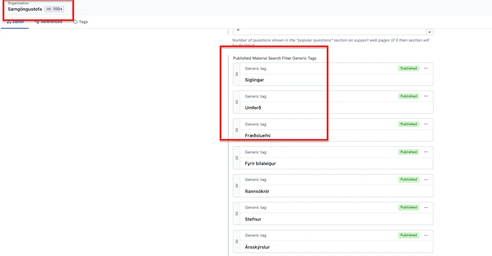 3. Til að birta síurnar þarf að opna Organization content týpu og bæta öllum Generic Tag í Published Material search Filter.