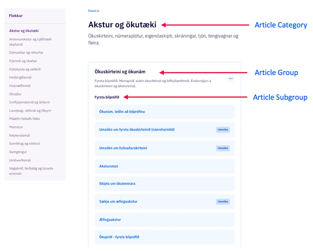 Virknin fyrir Article group / Article subgroup er notuð til þess að flokka efni saman og búa til yfirlit fyrir notandann inni í leiðakerfi Ísland.is.