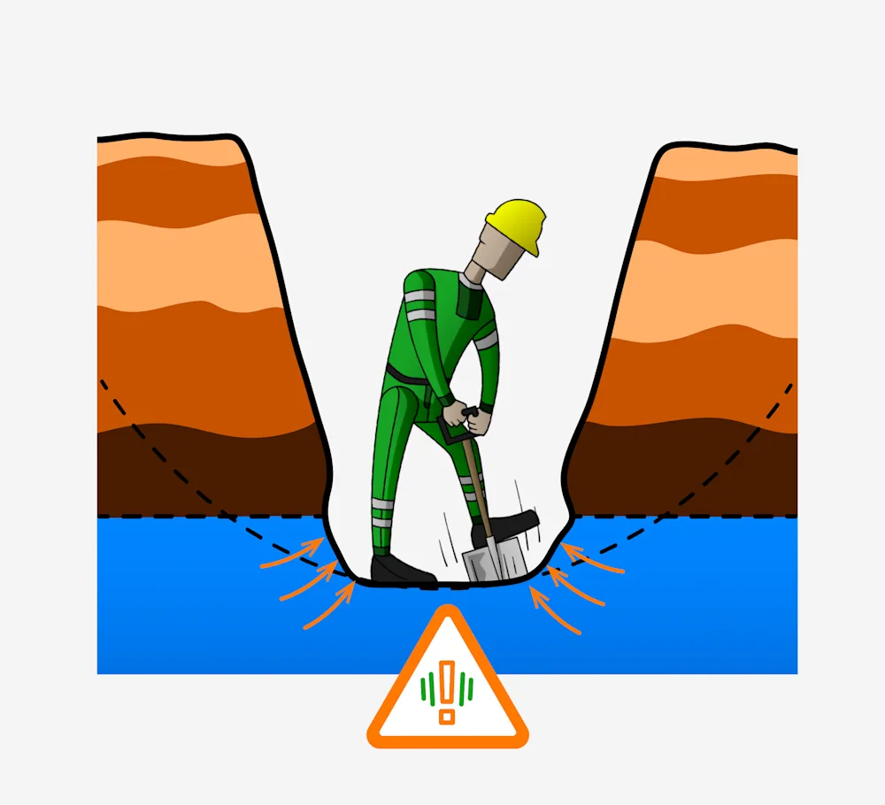 When excavating in wet clay or saturated sand in deep trenches (below the groundwater level), there is a risk of bottom failure or water pressure pushing up from the trench floor. In such conditions, sheet piling should be used.