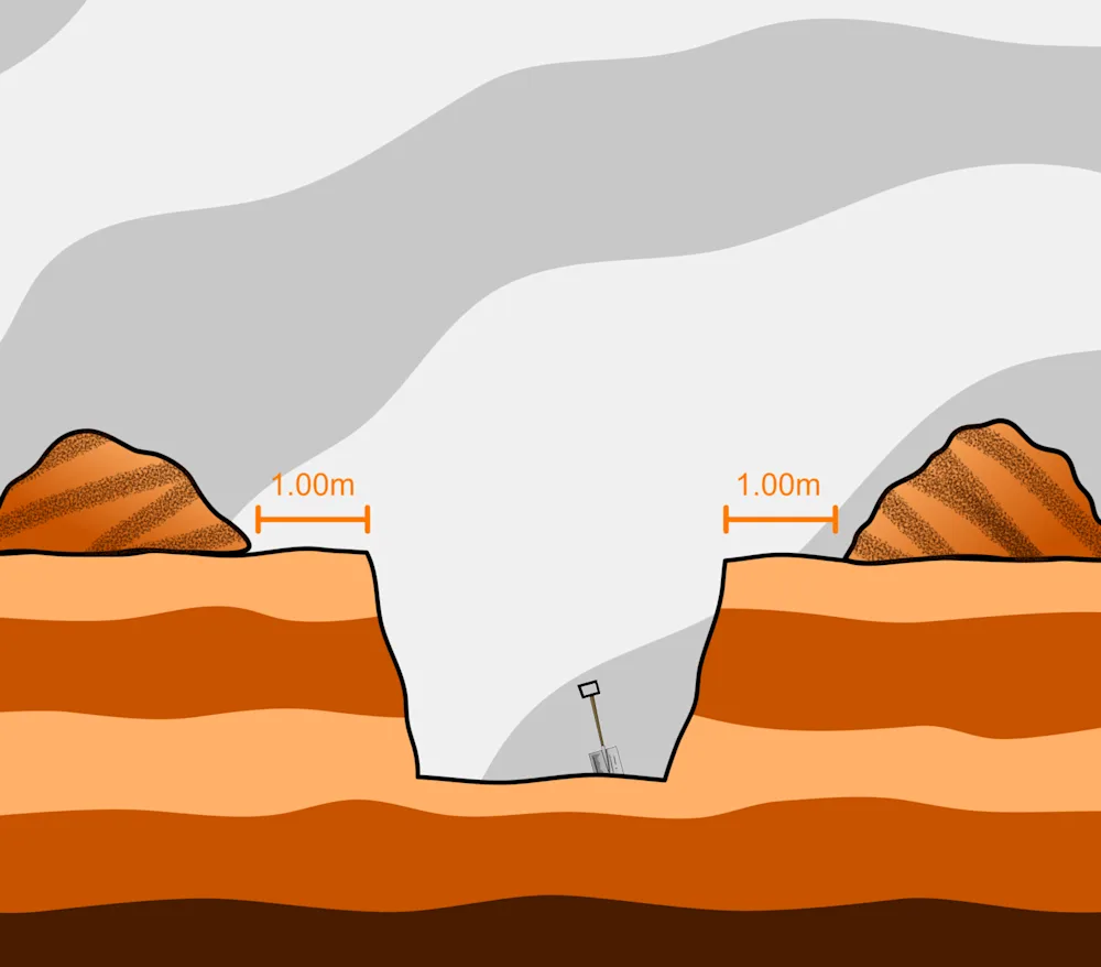 Loose rocks can easily slide into the trench if the material is placed too close. It should also be possible to walk safely along the trench banks without creating a risk of collapse onto anyone working inside the trench.