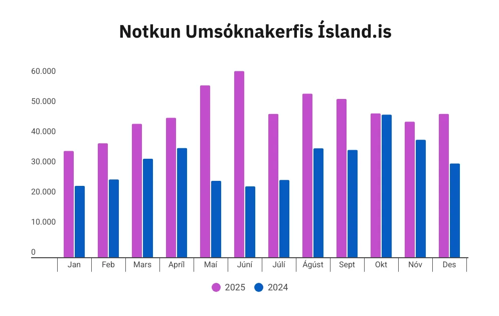 The most popular application last year was the change of ownership of vehicles at the Icelandic Transport Authority, 55,000 of these were processed last year. A new application for upper secondary education skyrocketed the numbers in the spring of 2025, with a total of over 9000 of them submitted last year. With it, the process of applying to secondary schools was greatly simplified for students, guardians and staff of the secondary schools.