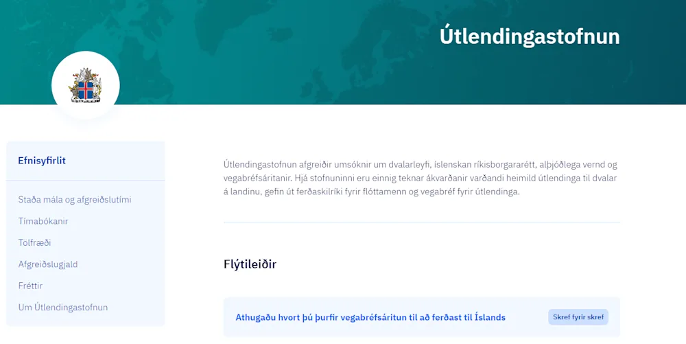 The Directorate of Immigration has moved its website to Ísland.is in collaboration with Digital Iceland. The Directorate's website is thereby accessible through the gateway to all of Iceland's public services. The content of the website was reviewed based on the needs of users and partly rewritten on this occasion. The overall objective of these changes is to improve services for users of the website who are primarily applicants for residence permits, visas, and Icelandic citizenship.
