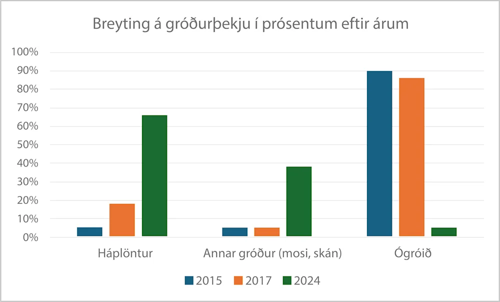 One of the initiatives undertaken by Land and Forest Iceland involves assessing the results of land reclamation efforts carried out by farmers engaged in quality-controlled sheep production. These farmers adhere to a land improvement plan as part of their operations. Land and Forest Iceland is responsible for evaluating the land use component of quality-controlled sheep production. This autumn, the inaugural measurements were conducted in accordance with a new work process that provides improved accuracy and more comprehensive information regarding the progress of the reclamation. The enclosed photographs depict the outcomes achieved at Álftaver Highland Pasture since 2017.