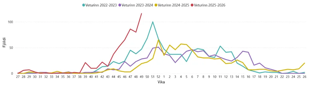 Of other respiratory viruses besides those mentioned above, rhinovirus (common cold) is detected the most at the Department of Microbiology and Virology at Landspítali. Over the past month, the weekly number of rhinovirus detections has ranged from 20–40, and in week 49, 28 individuals were diagnosed with rhinovirus.