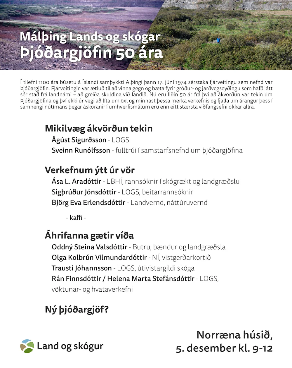 A symposium will be held at the Nordic House in Reykjavik on December 5th to commemorate the 50th anniversary of the Icelandic parliament's approval of a special budget for the National Gift project. This project was created to address the decline in vegetation and soil erosion that Iceland has experienced since human settlement.