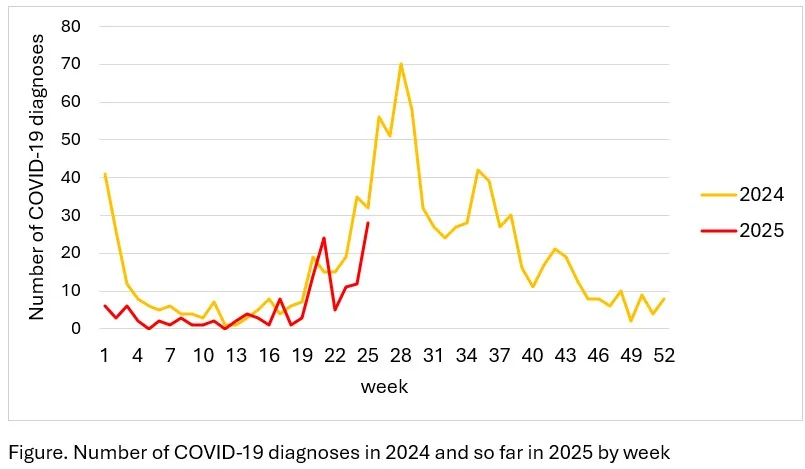 The current pattern resembles the summer of 2024, when a wave of infections began in the spring and peaked in July. At that time, the highest weekly total occurred in week 28 (July 8–14), with 70 individuals testing positive (see figure). A similar wave may now be emerging.