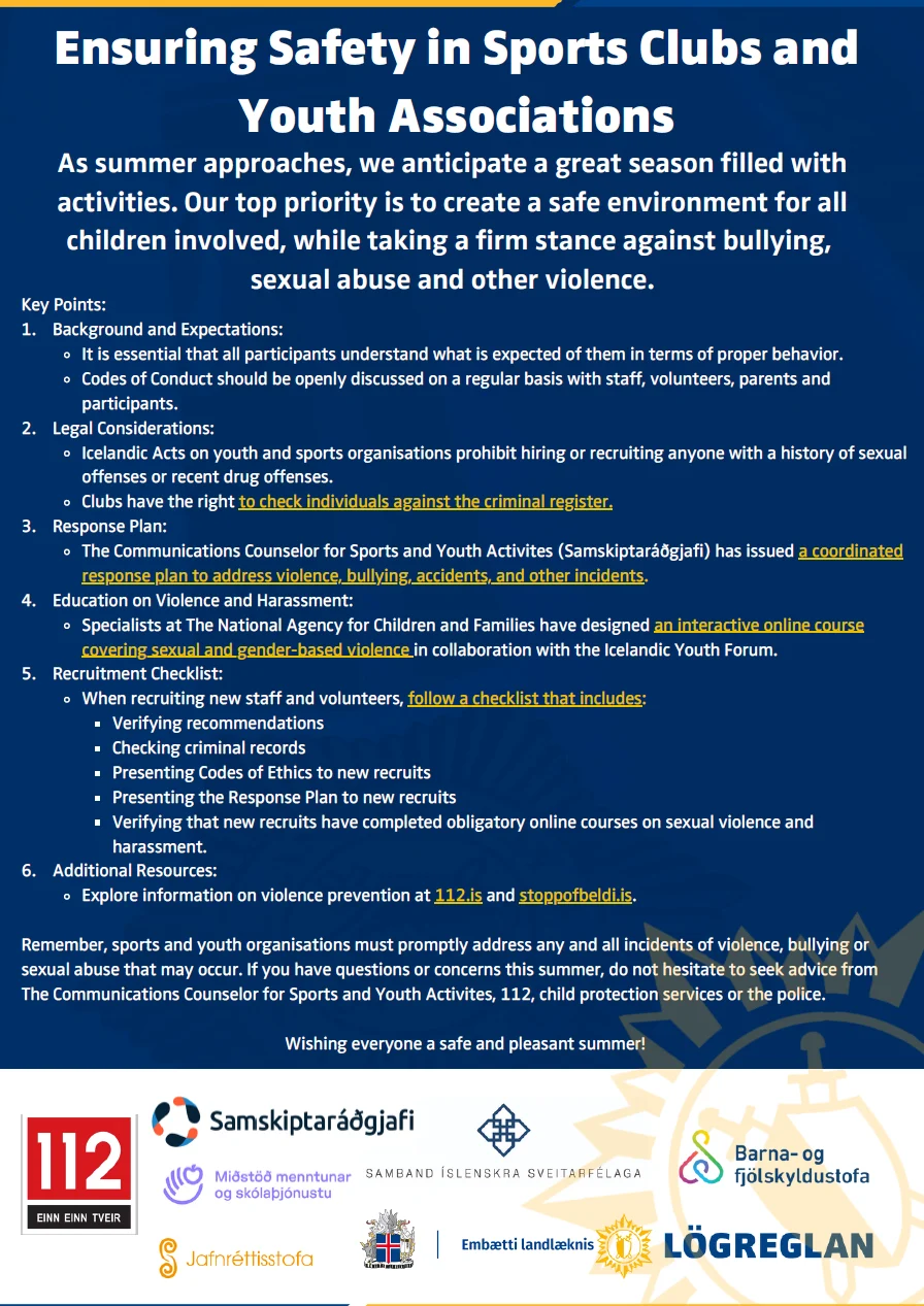 The Directorate of Health has, in collaboration with numerous partners, published an information letter containing helpful information and links to education and guidance in violence prevention. For example, a checklist for recruiting new staff and volunteers and guidelines for obtaining information from criminal records. There is also a link to a coordinated response plan for sports and youth activities.