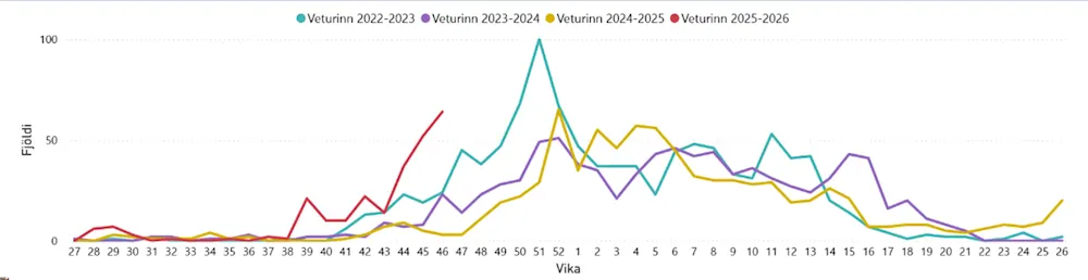 Rhinovirus (the common cold) continues to be the most frequently detected respiratory virus at the Landspítali Department of Microbiology and Virology. Over the past month, the weekly number of rhinovirus detections has ranged from 20 to 40, but in week 46, 16 cases were detected.