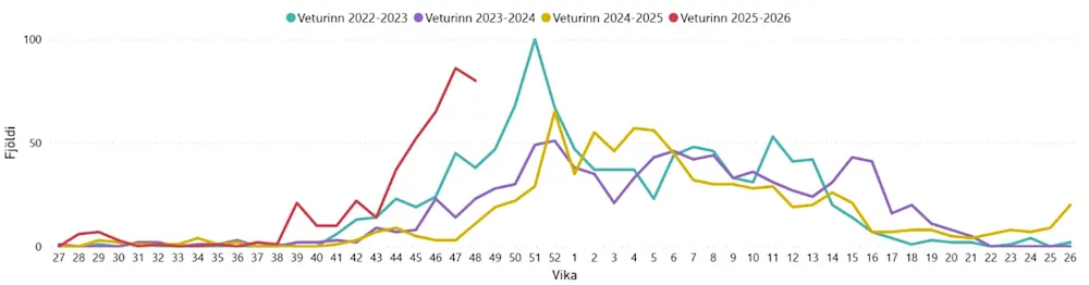 Of other respiratory viruses besides those mentioned above, rhinovirus (common cold) is detected most frequently at the Department of Microbiology and Virology at Landspítali. Over the past month, the weekly number of rhinovirus detections has ranged from 20 to 40, and in week 48, 19 cases of rhinovirus were diagnosed.