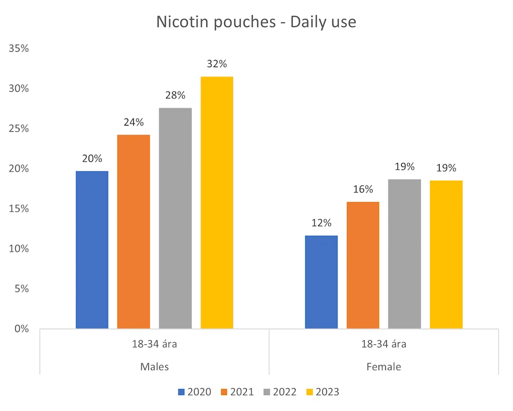 The use of nicotine pouches has increased rapidly in Iceland in recent years. Daily use among young men in the age group 18-34 years measured 32% last year.