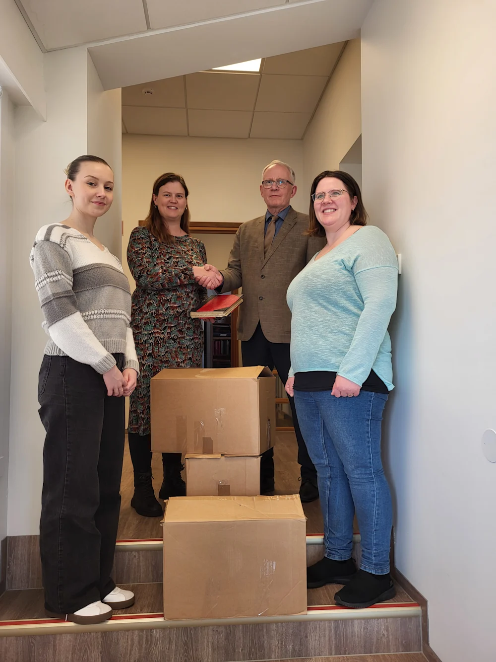 In the photo, you can see Jarþrúður Hanna Jóhannesdóttir, department manager and deputy national auditor, Jónas B. Guðmundsson, district commissioner of the Westfjords, and in front of them stand Martyna Julia Czubaj, office worker, and Thelma Dögg Theodórsdóttir, lawyer, with the mentioned boxes between them.