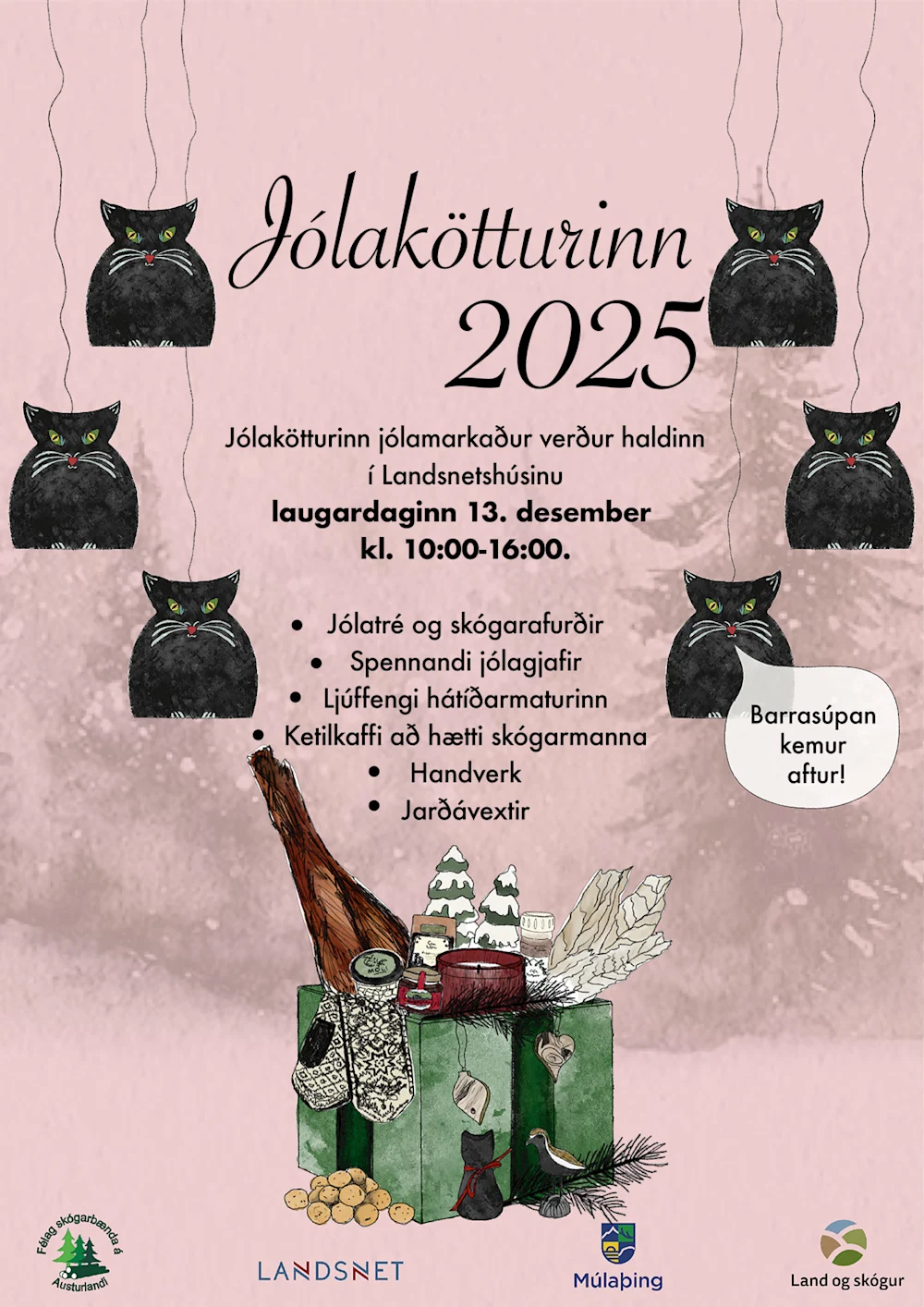 The annual Christmas market, Jólakötturinn, is scheduled to take place at the Landsnet building in Egilsstaðir on Saturday, 13 December, from 10:00 AM to 4:00 PM. The event will feature a selection of Christmas trees and various forest products, a diverse array of unique Christmas gifts, handcrafted items, delectable festive foods, ground fruits, and complimentary kettle coffee, served in the traditional forestry style.