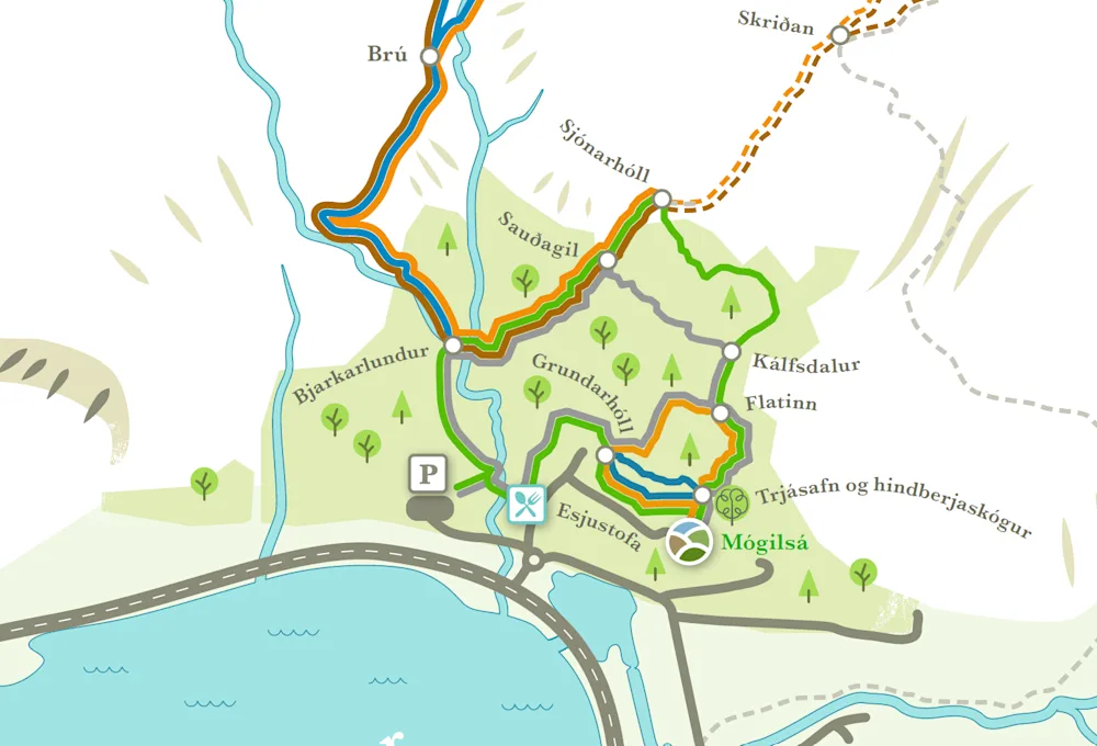 Mount Esja, a beloved outdoor recreation area near the capital, boasts numerous trails winding through forests, across streams and banks, and along wooded slopes. The Mógilsá path network connects to the Esjustígar (Esja Trails, see map below), while many smaller trails offer delightful alternatives to the usual Esja hiking route. We highly recommend a shorter, forested Esja hike.