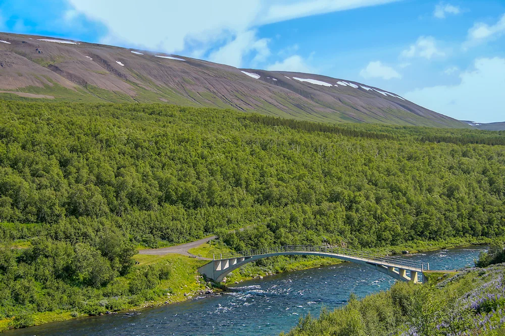 The Vaglaskógur National Forest forest in Fnjóskadalur Valley, is a popular destination in Iceland, conveniently located a 20-minute drive from Akureyri via the Vaðlaheiði Tunnel (toll road) or a 30-minute drive via the Víkurskarð mountain pass. The forest covers approximately 4.5 square kilometers.
