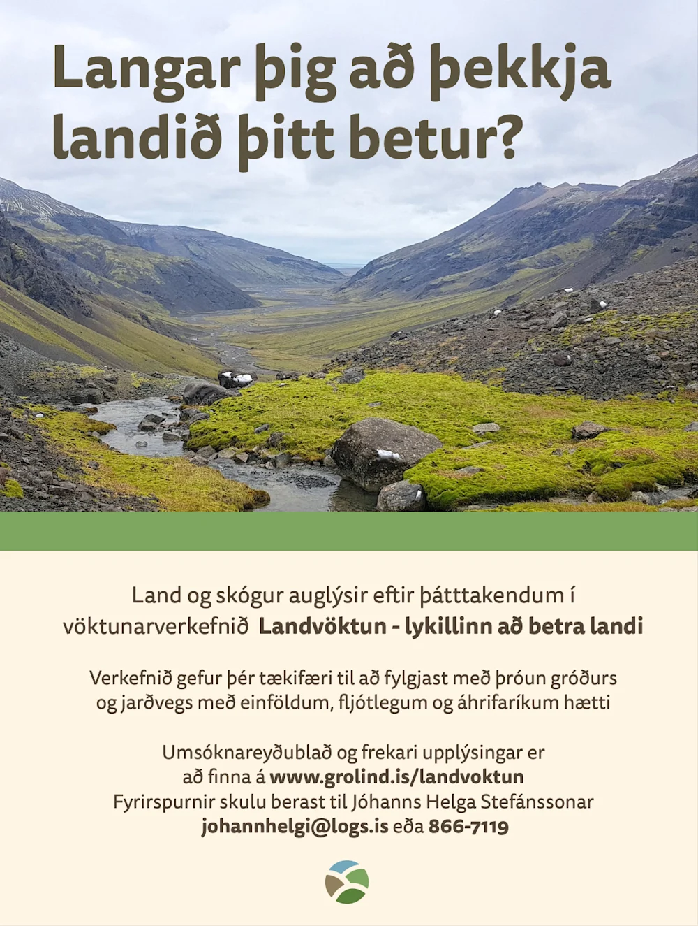 Further information can be found on the Grólind’s website, www.grolind.is/landvoktun. Jóhann Helgi Stefánsson also provides information by phone 866 7119 or by email to the email address johannhelgi@logs.is.