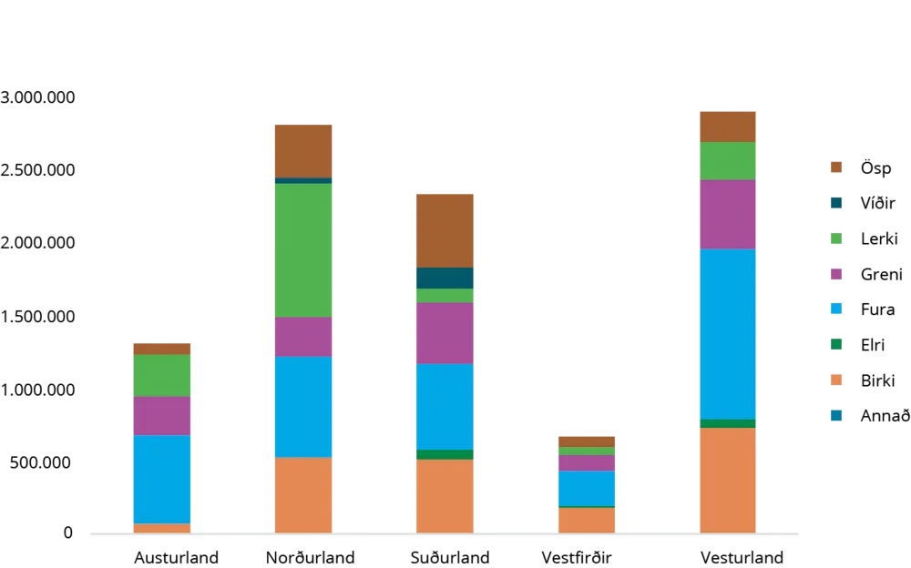 According to the overview, planting activity varied between regions. The largest number of trees were planted in West Iceland and North Iceland, together accounting for more than half of all plantings, followed by South Iceland. The bar chart below shows the distribution of tree species by region in forest farmers' plantations 2025.