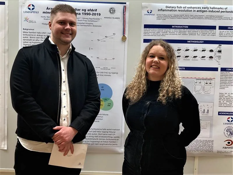 Two best posters for a scientific project at the Landspítali Science Festival, Science in the Spring, in Hringsalur, on April 26, 2023, were awarded in kind. The writers of the awards are medical student Þórður Björgvin Þórðarson and PhD student Kirstine Nolling Jensen.