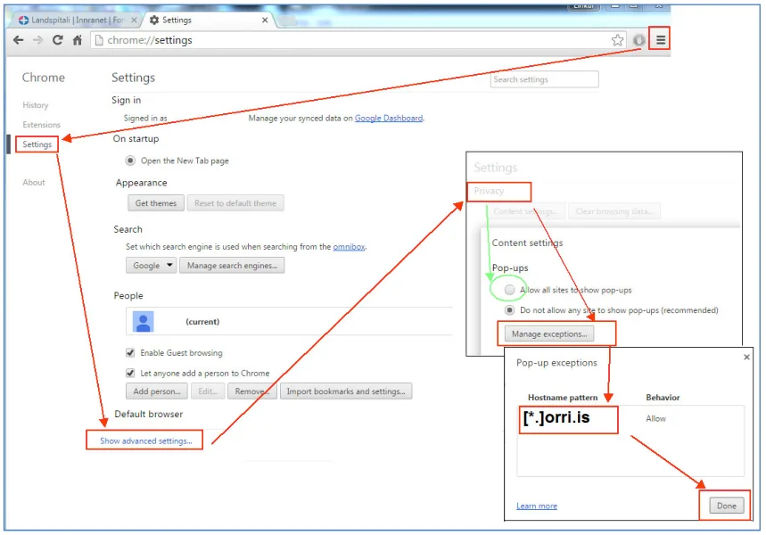 If you want to keep the pop-up blocker active, add the address https://orri.is and click Allow button in the Address of website field (red in the image). Remember to include the prefix https: - Confirm with Save Changes.