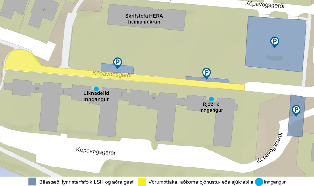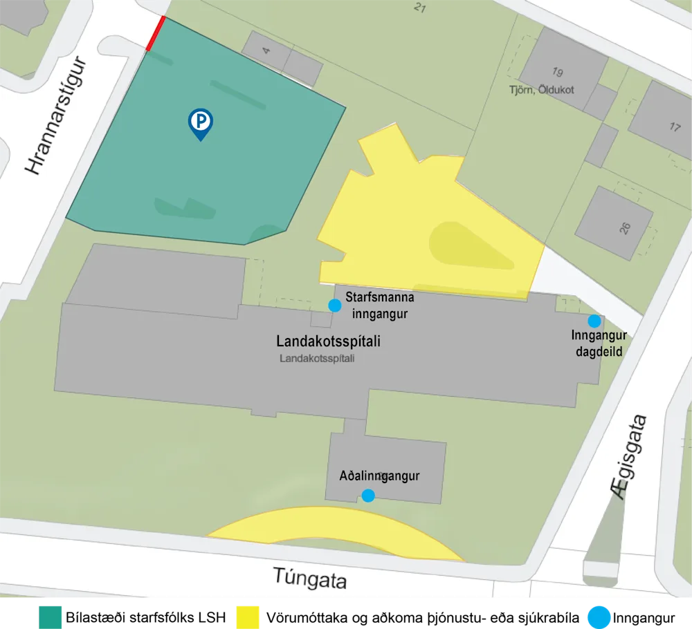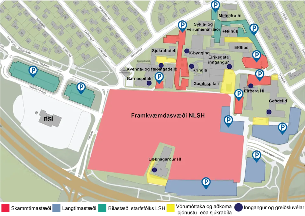 Yellow zones are reserved exclusively for deliveries, Landspítali service vehicles, and emergency vehicle access.