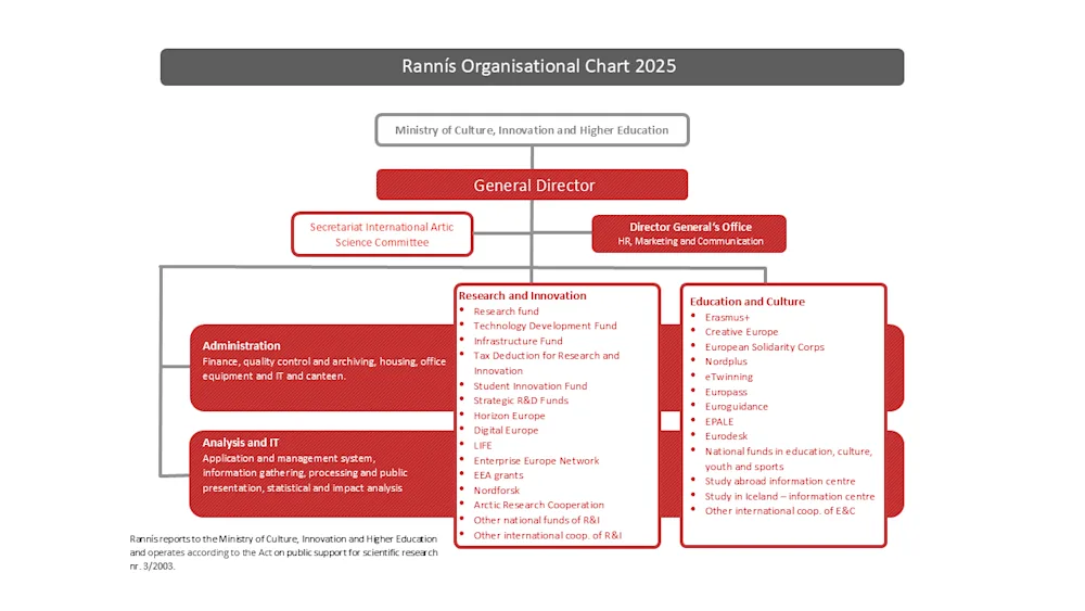 Rannís operates under the auspices of the Ministry of Culture, Innovation and Higher Education on the basis of the Act on Public Support for Research no. 3/2003.