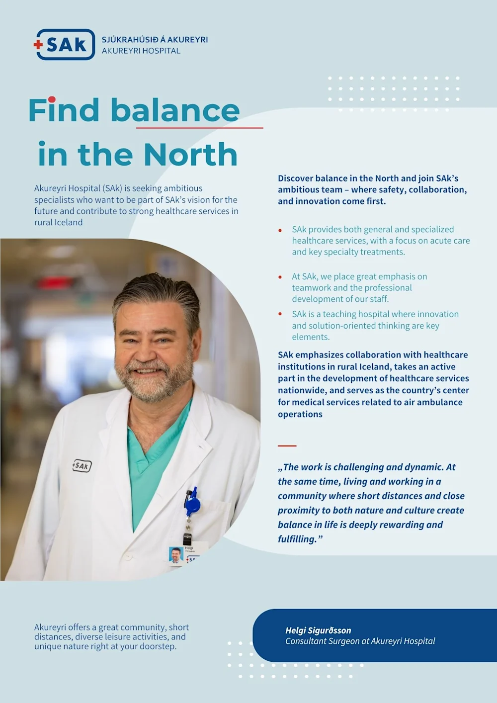 Akureyri Hospital (SAk) draws the attention of specialists to a wide range of exciting career opportunities for physicians at the hospital.