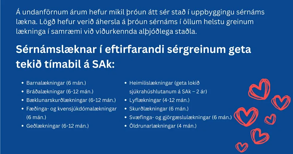 Specialist medical training in Iceland has developed rapidly in recent years. Today, specialist training is offered in most core medical disciplines in Iceland in line with international quality standards.