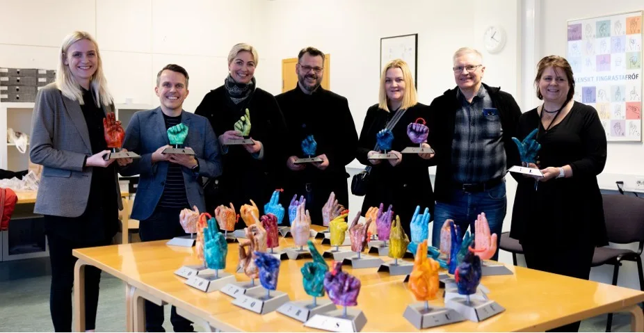 The idea for the project came up when Julius noticed during a sign language course at SHH that other students had difficulty recognizing the formation of their fingerprints from two-dimensional images. His goal was therefore to create a work that could also be used as a teaching tool for those learning sign language. The stands are matte, but Júlíus states that: “shiny objects can disturb those with visual impairments.” Each stand is marked with an appropriate letter in Icelandic writing and dotted font, making it a very accessible teaching tool. All the hands are in different colours but the thinking behind it was that children could possibly more easily connect each letter to a certain colour.