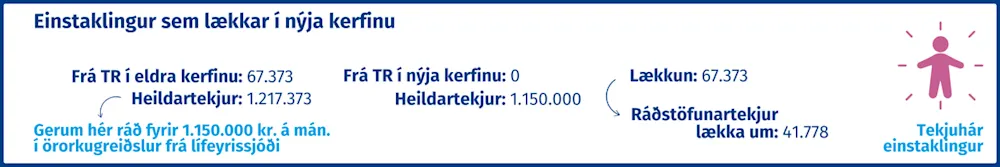 Figure 8. A young individual who still lives at their parents' home is a participant in the labour market and earns ISK 350,000 in monthly income. The example shows how they fare in the old system on the one hand, and in the new system on the other. In the new system, they have a partial disability pension.