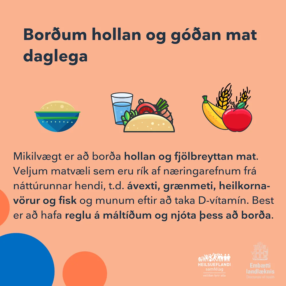 Mikilvægt er að borða hollan og fjölbreyttan mat. Veljum matvæli sem eru rík af næringarefnum frá náttúrunnar hendi, t.d. ávexti, grænmeti, heilkornavörur og fisk og munum eftir að taka D-vítamín. Best er að hafa reglu á máltíðum og njóta þess að borða.