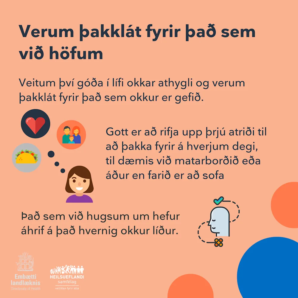 Embætti landlæknis hefur tekið saman tíu heilræði sem byggja á niðurstöðum rannsókna á því hvað er mikilvægt að hafa í huga til að hlúa vel að andlegri, líkamlegri og félagslegri vellíðan. Heilræði dagsins í dag snýr að þakklæti.