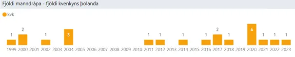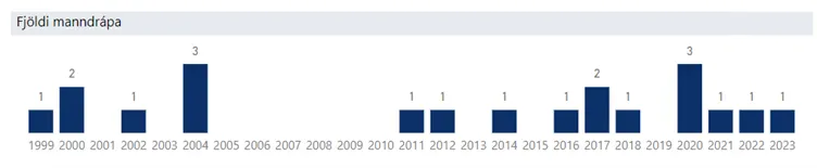 Samantekt gagnavísindadeildar ríkislögreglustjóra um fjölda látinna kvenna og stúlkna vegna manndrápa á Íslandi árin 1999 til 2023 sýnir að 21 kona hefur látist vegna manndráps á tímabilinu, þar af tvær stúlkur undir 15 ára aldri. Yfir sama tímabil hafa 33 karlar látist vegna manndrápa.
