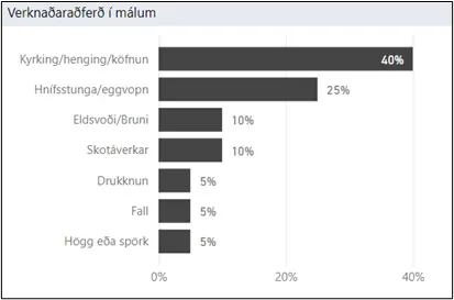 Þegar litið er til allra manndrápa var algengast að hnífi eða eggvopni hefði verið beitt eða í 39 prósent tilvika. Næst algengast var kyrking, henging eða köfnun, eða í 25 prósent tilvika. Þar á eftir komu högg eða spörk, í 16 prósent tilvika. Í málum þar sem þolendur voru konur er kyrking, henging eða köfnun algengust, eða í 40 prósent tilvika, og í fjórðungi tilvika var hnífi eða eggvopni beitt. Í 10 prósent tilvika var það eldsvoði eða bruni og í 10 prósent tilvika skotáverki.