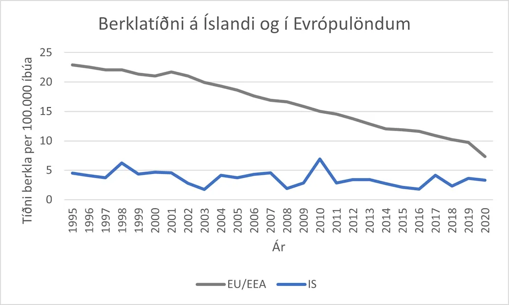 Hér á Íslandi var hápunktur berklafaraldursins fyrir tilkomu virkrar lyfjameðferðar heldur seinna á ferð en víðast hvar í Evrópu, eða á fjórða áratug 20. aldar. Á fimmta og sjötta áratugnum komu smám saman fram lyfin sem enn þann dag í dag eru kjarninn í meðferð berkla, þ.e.a.s. berkla sem eru næmir fyrir venjulegri meðferð. Í kjölfarið fór að fækka einstaklingum á berklaskrá og nýjum smitum. Undanfarna 3 áratugi hefur nýgengi berkla hér á landi verið um 2–5 tilfelli á hverja 100.000 íbúa ár hvert, með því lægsta sem gerist í Evrópu (mynd 1). Stór hluti tilfella hér undanfarna áratugi hefur komið upp meðal einstaklinga sem flust hafa hingað til lands, oftast á fullorðinsárum, en endurvakning sýkingar hjá eldra fólki sem líklega smitaðist hér á landi á unga aldri hefur átt sinn þátt í tilfellum hér á landi allt fram til dagsins í dag. Örfá tilvik undanfarin 20 ár eiga rætur að rekja til nýlegra smita innanlands, en hér hefur áratugum saman tíðkast að rekja smit þegar smitandi berklar koma upp og bjóða þeim sem hafa smitast af berklum fyrirbyggjandi meðferð sem dregur verulega úr líkum á að bakterían nái bólfestu og valdi síðar sjúkdómi.
