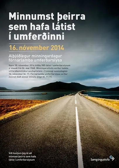 Sunnudaginn 16. nóvember var haldinn alþjóðlegur minningardagur þar sem minnst var þeirra sem látist hafa í umferðinni. Vegna þessa var haldin minningarathöfn við bráðamóttöku Landspítalans í Fossvogi, en fórnarlamba umferðarslysa var minnst við athöfnina með einnar mínútu þögn.