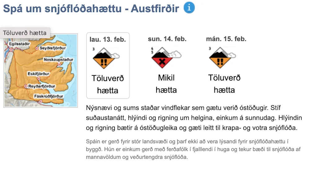 The Icelandic Met Office announces an uncertainty phase taking effect in East Iceland at 8pm tonight, due to a risk of avalanches as a result of a heavy rain forecast for the next 36 hours. The forecast is for increasing rain with southeast winds beginning tonight as rain in the lowland but sleet or snow in the mountains. It gets warmer tomorrow and could rain up in mountain tops with southeast winds of 13-18 m/s. The forecast is for rain of 100-200 mm. Considerable snow is in some places in the mountains and under these conditions, wet avalanches could fall and even slush slides or mudslides as the weather progresses. Conditions will be monitored and assessed tomorrow, Sunday, with view of whether arrangements will be needed, e.g. in Seyðisfjörður where mudslides fell in December. According to the weather forecast, the rain will decrease rapidly Sunday night.