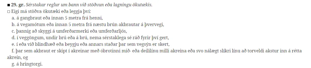 Umferðarlögin eiga það til að vefjast fyrir fólki enda margt sem ber að hafa í huga. Sérstakar reglur um bann við stöðvun eða lagningu ökutækis, eins og segir í 29. gr. laganna, er þar á meðal og því er full ástæða til að rifja hana upp, en vakin er sérstök athygli á f liðnum: þar sem akbraut er skipt í akreinar með óbrotinni mið- eða deililínu milli akreina eða svo nálægt slíkri línu að torveldi akstur inn á rétta akrein.