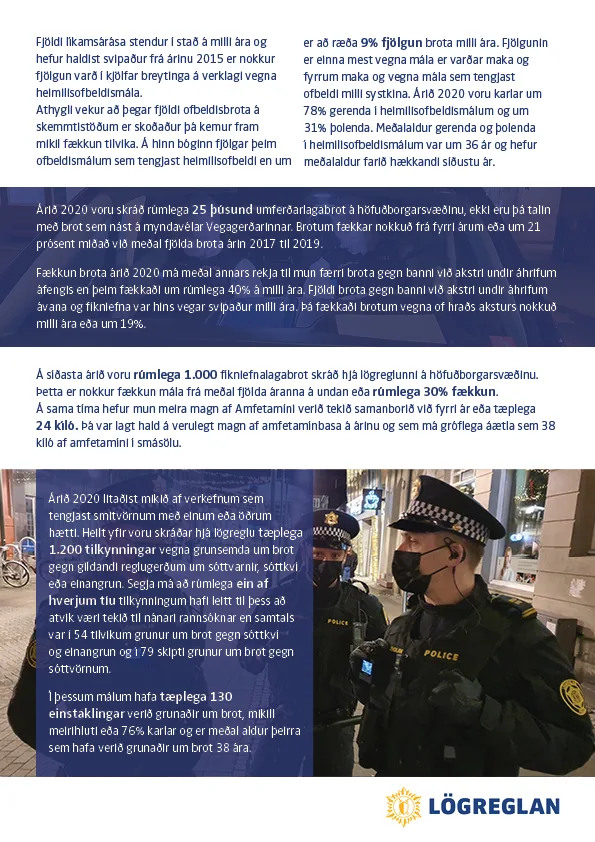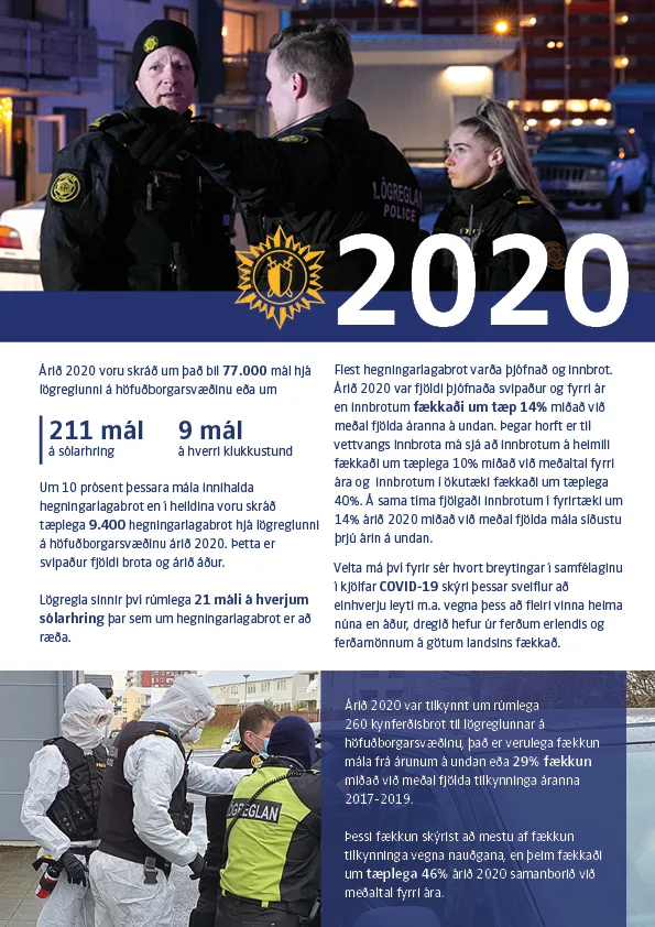 Árið 2020 hefur verið viðburðaríkt hjá Lögreglunni á höfuðborgarsvæðinu og óvenjulegt miðað við fyrri ár. Þar ber helst að nefna að árið hefur litast mjög af viðbrögðum vegna heimsfaraldurs Covid-19. Hér má finna upplýsingar um fjölda mála og helstu tölur. Hafa ber þann fyrirvara á þessum upplýsingum að tölur fyrir árið 2020 eiga enn eftir að breytast. Þessar upplýsingar gefa þó innsýn í það hvert stefnir.