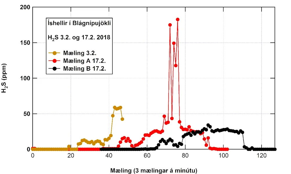 Dagana 3. og 17. febrúar s.l. voru gerðar mælingar á brennisteinsvetni í íshelli sem staðsettur er í Blágnípujökli, suðvestur af Hofsjökli. Hellir þessi hefur ekki verið meðal fjölfarinna ferðamannastaða en nú er svo komið að nokkur fjöldi fólks fer þarna með vel búnum fjallabílum í viku hverri. Fréttir hafa sést í fjölmiðlum um alvarlegt atvik sem talið er tengjast menguninni. Utan hellisins var styrkur brennisteinsvetnis (H2S) við 0 en eftir nokkurra mínútna göngu inn eftir hellisgólfinu var styrkurinn kominn yfir 20 ppm. Síðan fór hann hækkandi og á 2 mínútna tímabili mældust mjög há gildi, á bilinu 120-183 ppm. Við slíkan styrk brennisteinsvetnis er bráðahættuástand, lyktarskyn hverfur og erting öndunarfæra vex