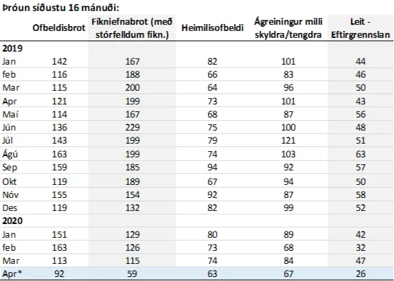 Í fyrstu töflunni má sjá fjölda brota eftir völdum brotaflokkum síðastliðna 16 mánuði, þess ber að geta að enn eiga eftir að bætast við tölur fyrir í 10 daga í apríl.