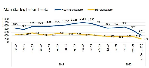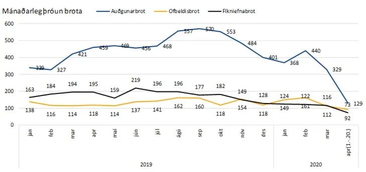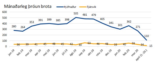 Þess ber að geta að um er að ræða bráðabirgðatölur og miðast þær við stöðuna í málaskrárkerfi lögreglu þann 20.apríl 2020.