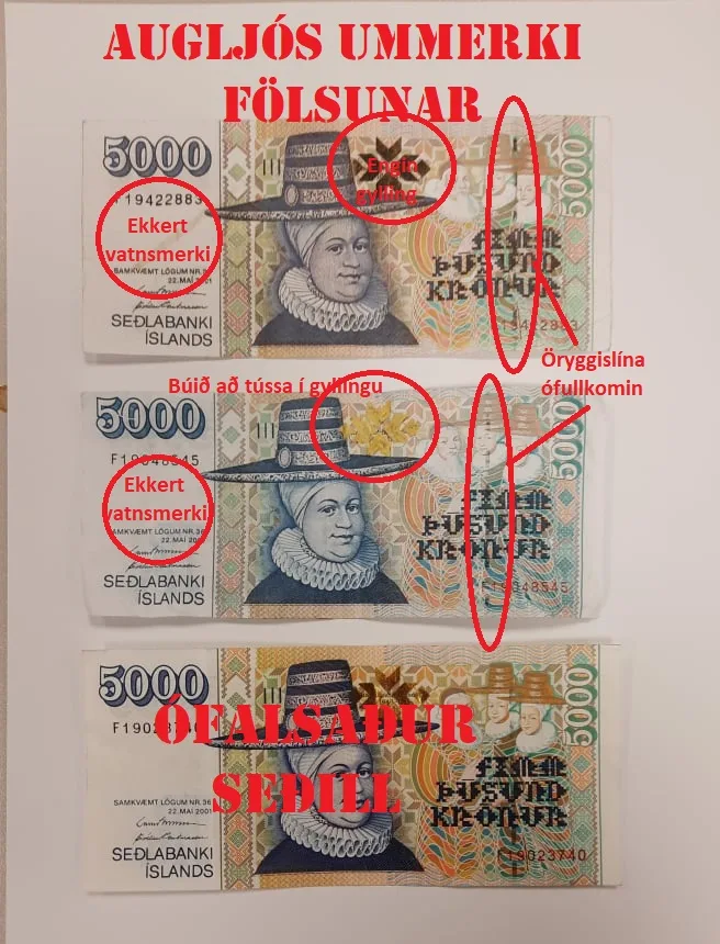 Þó að það séu 5.000 kr. seðlar sem við erum að sjá mest af þá biðjum við fólk einnig um að vera á varðbergi með aðrar seðlastærðir sem og erlenda seðla. Það hafa komið upp mál þar sem erlendir seðlar eru falsaðir.