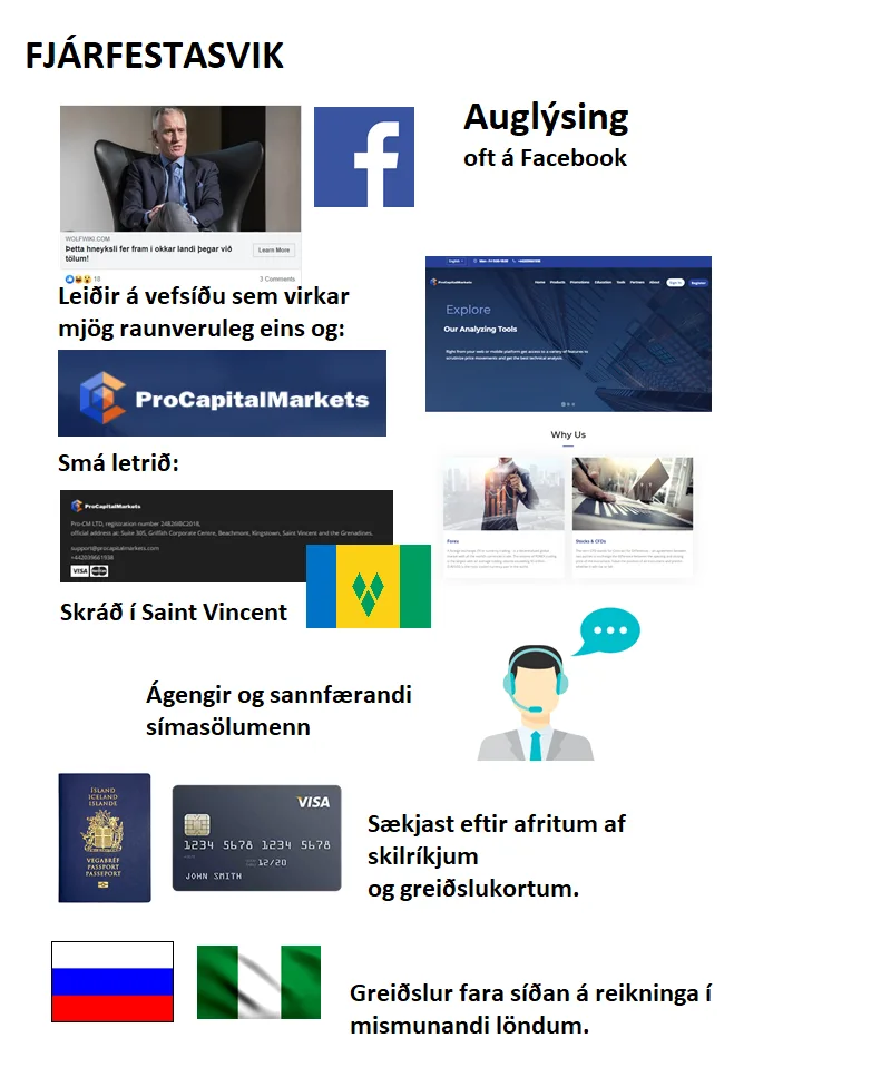 Fólk sér þessar auglýsingar og ef það smellir á þær þá fer það á síður sem í fljótu bragði virðast vera fjárfestingarfyrirtæki. Þar er fólk hvatt til að skrá sig og í framhaldi fær það símtal frá tunguliprum en ágengum sölumönnum sem vilja endilega bjóða þeim pakka. Oft er fyrsta upphæðin ekki stór, kannski 250 til 300 evrur eða dollarar, en það er bara byrjunin. Í framhaldi berast önnur símtöl og flækjustig. Fólk er beðið að skanna inn og senda myndir af persónuskilríkjum og greiðslukortum. Sumir hafa lent í því að óheimilar úttektir eru gerðar á kortin þeirra enda eru svindlararnir komnir með allar upplýsingar sem að þeir þurfa. Í öðrum tilvikum halda símasölumennirnir áfram að hringja og vilja að viðkomandi fjárfesti meira og meira enda sé væntanlegur ávinningur mikill.