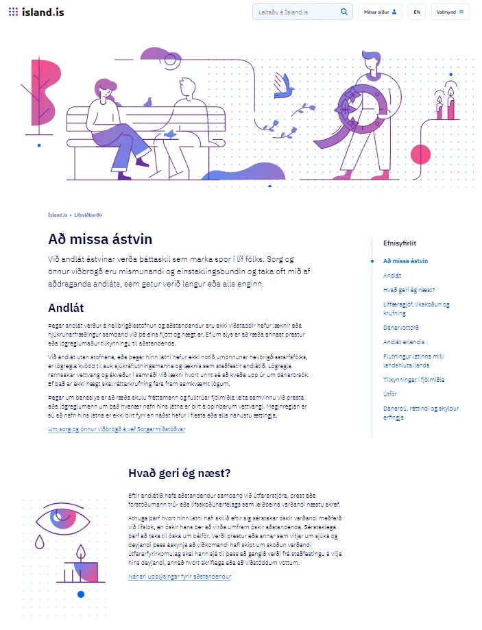Þrjár leiðir eru nú að efni og upplýsingum á Ísland.is og ein þeirra er Lífsviðburðir en þeir eru í sífelldri þróun og í grunninn hugsaðir fyrir þá sem hafa ekki aðgang að stuðningsneti. Að missa ástvin er nýr lífsviðburður á Ísland.is sem tekur saman helstu upplýsingar fyrir aðstandendur látinna einstaklinga.