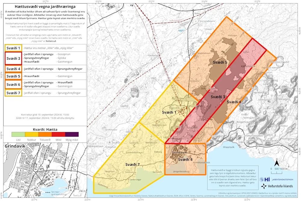 Ríkislögreglustjóri í samráði við lögreglustjórann á Suðurnesjum ákvað þann 6. september 2024 að færa almannavarnastig af hættustigi á óvissustig þar sem eldgosinu norðan við Stóra – Skógfell er lokið. Gosið sem hófst að kvöldi fimmtudagsins 22. ágúst 2024 er stærsta eldgosið á Sundhnúksgígaröðinni til þessa. Það stóð yfir í um 14 daga. Þá er kvikusöfnun hafin að nýju undir Svartsengi. Hraði á landrisi er svipaður og í fyrri atburðum. Hraunjaðarinn er enn virkur og það getur hrunið úr honum. Svæðið er hættulegt yfirferðar. Veðurstofan gaf út nýtt hættumat í gær sem gildir að öllu óbreyttu til 17. september nk., sjá viðhengi. Viðbúið er að sama atburðarás endurtaki sig á svæðinu.